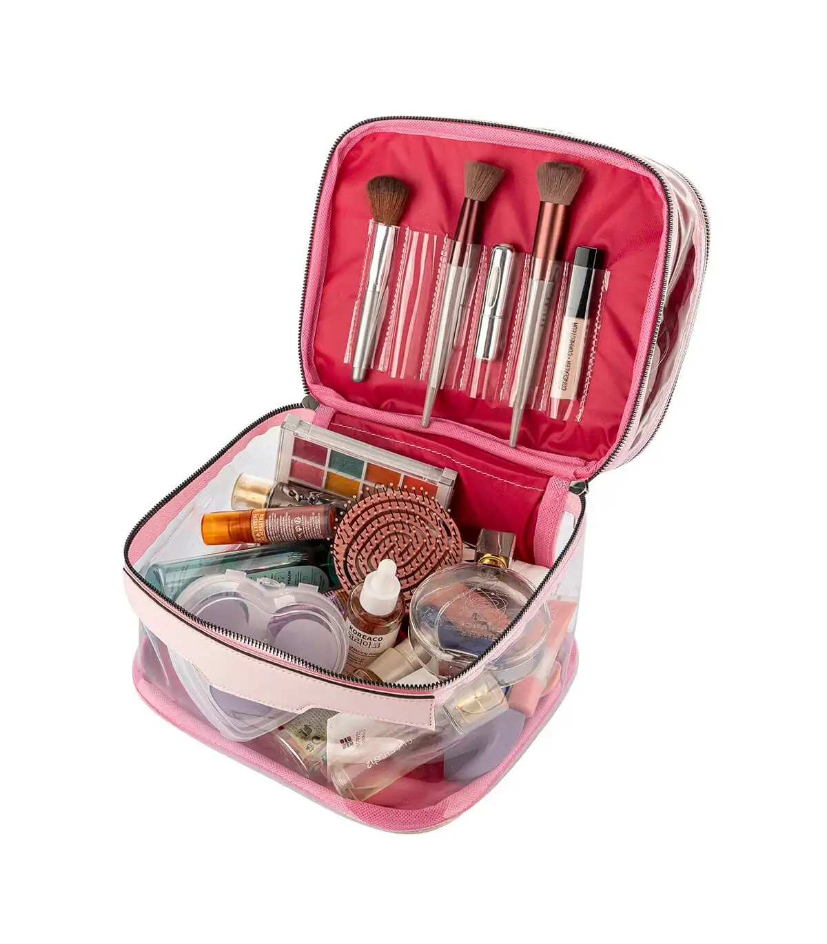 Fırça bölmeli şeffaf makyaj çantası, pratik kullanımıyla güzellik rutininizi düzenli ve erişilebilir tutmanıza yardımcı olur. Çantanın şeffaf ve fonksiyonel tasarımı; günlük rutininize zarif bir dokunuş eklerken, açmadan içindeki eşyalarınızı kolayca görmenizi sağlar.