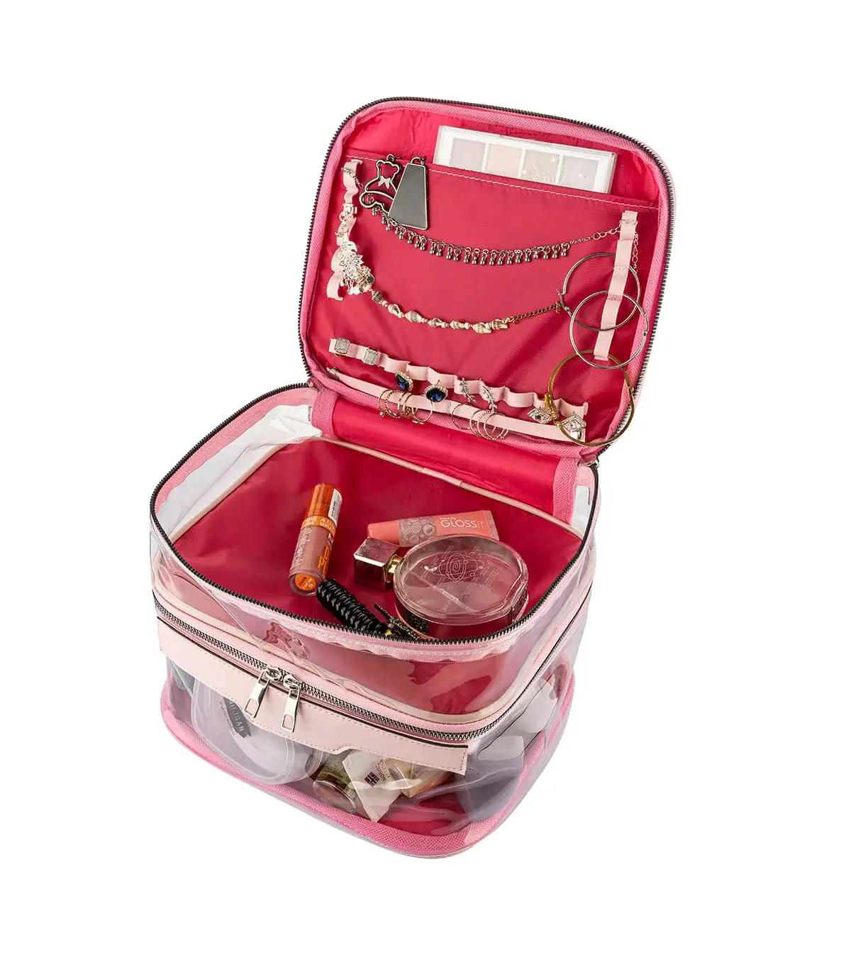 NS Reliable şeffaf çift katlı fırça bölmeli seyahat makyaj organizeri ve kozmetik çantası; makyaj malzemelerinizi, kozmetik ve kişisel bakım ürünlerinizi, aksesuarlarınızı tek bir yerde saklamak, düzenlemek ve taşımak için tasarlandı. Kullanımı kolay tutma sapına sahiptir. Hem seyahat hem de günlük kullanım için idealdir.